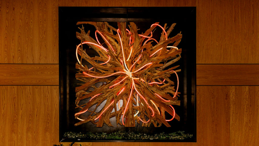 Biophilia is a dynamic art installation that evolves with its surroundings, adapting in shape and form to harmonise with the environment in which it resides. At the entrance of the Middle Eight Hotel in Covent Garden, its wool-coated neon tubes seamlessly interacted with the iconic driftwood wall, creating a striking fusion of organic and contemporary design.